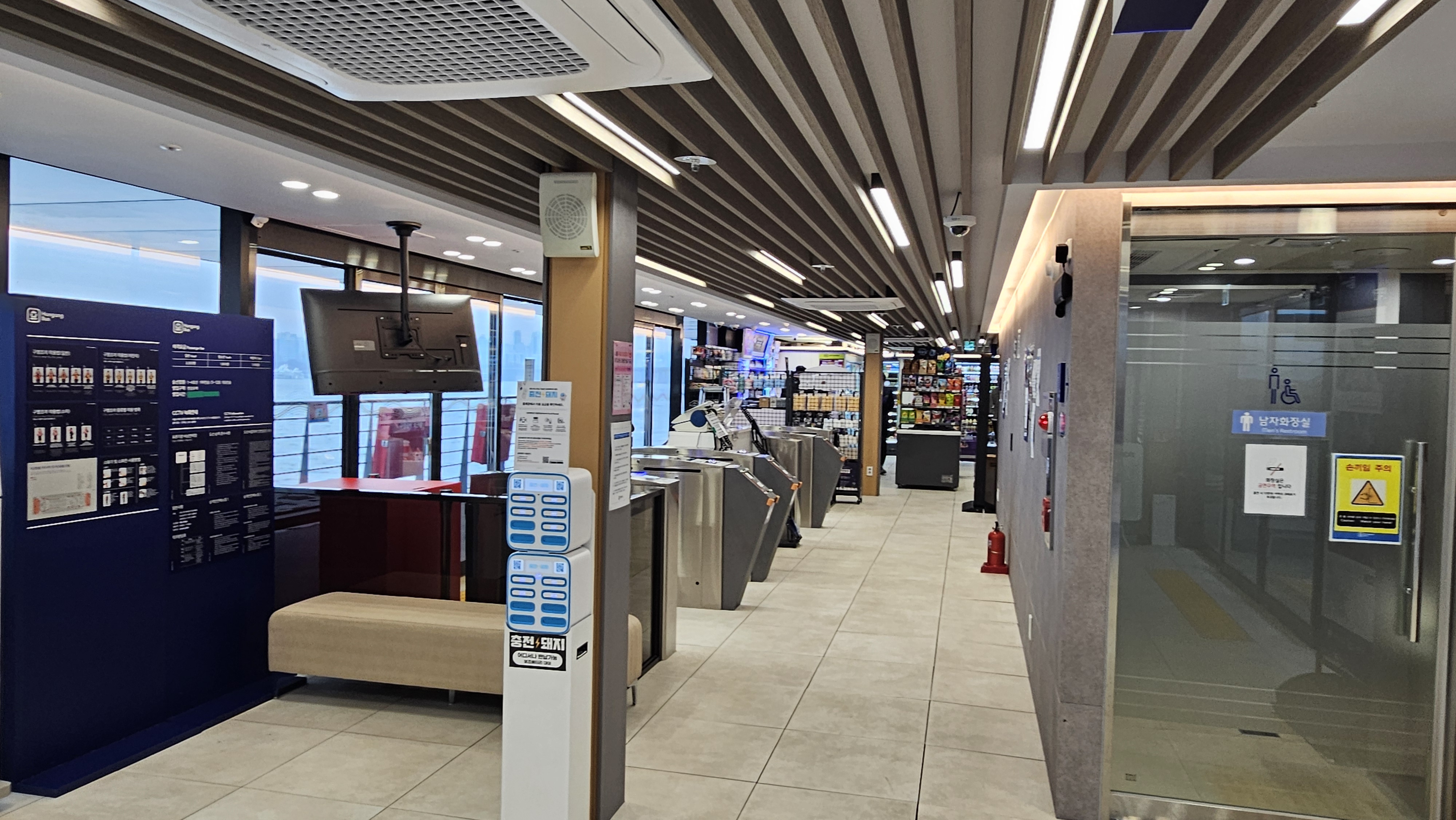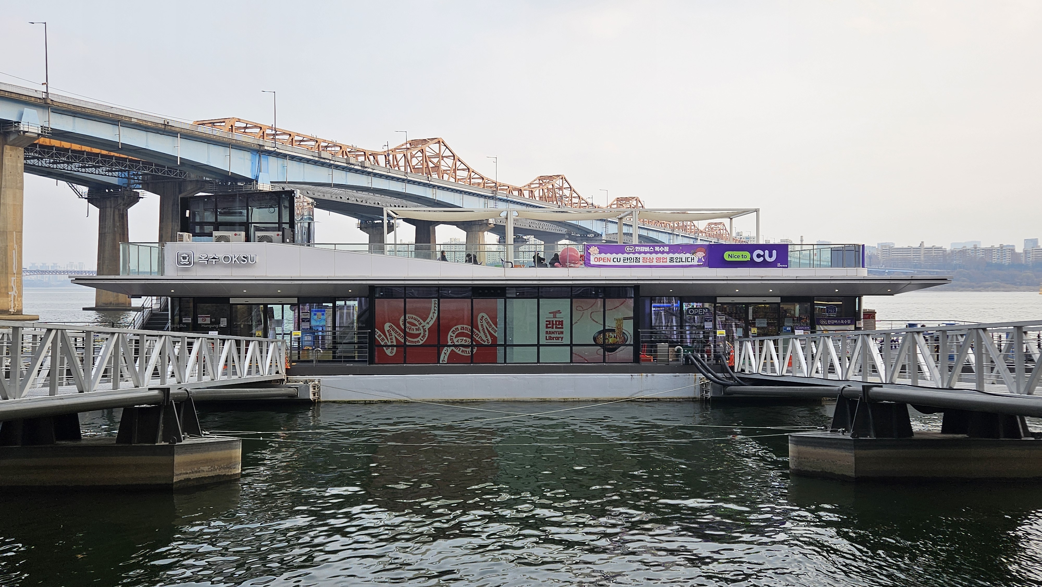 한강버스 옥수선착장 1층에는 한강버스 탑승구와 CU편의점이 있습니다.