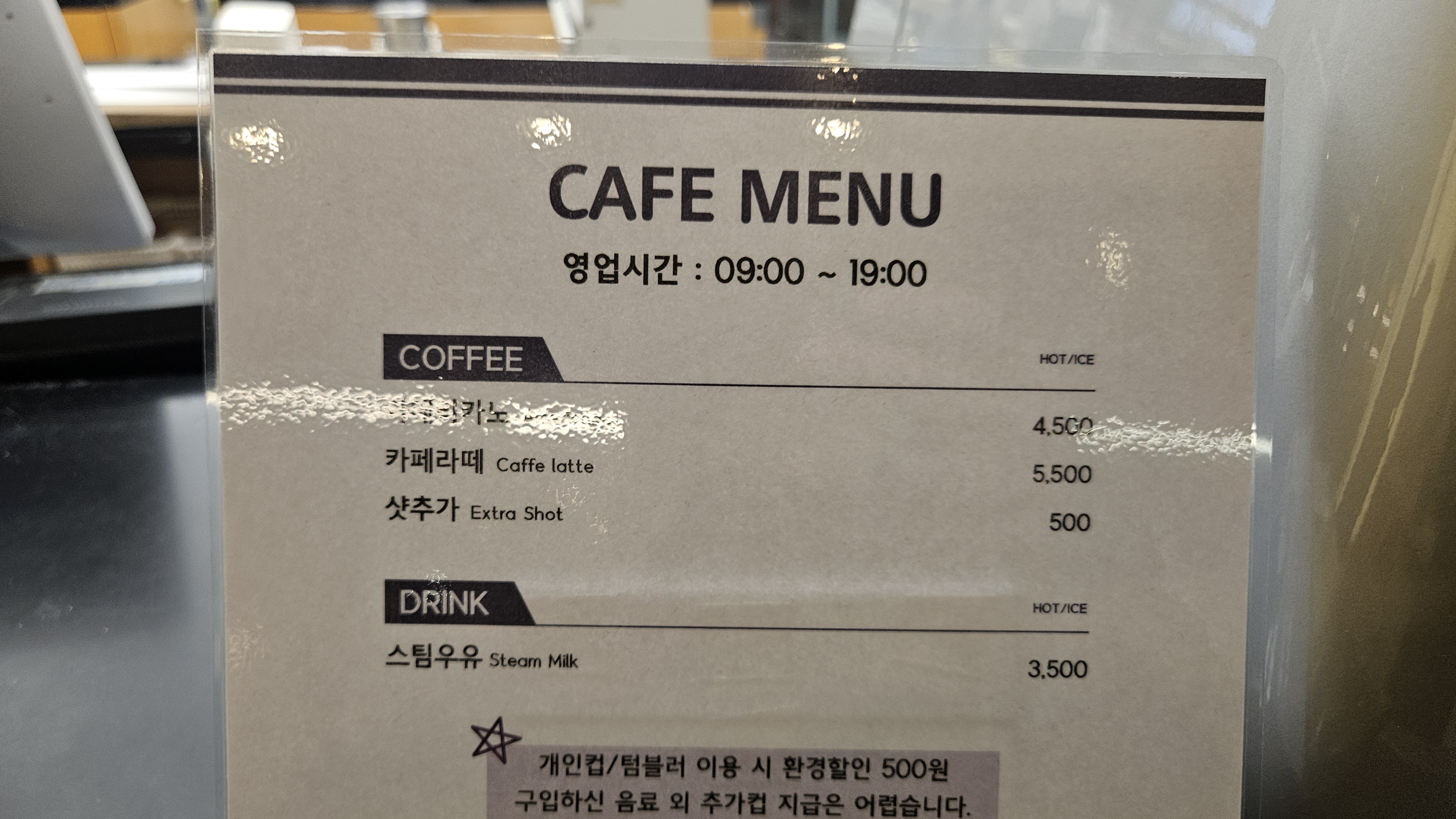 아메리카노 4,500원, 카페라떼 5,500원, 스팀우유 3,500원 등 3가지 음료메뉴를 판매하고 있습니다.