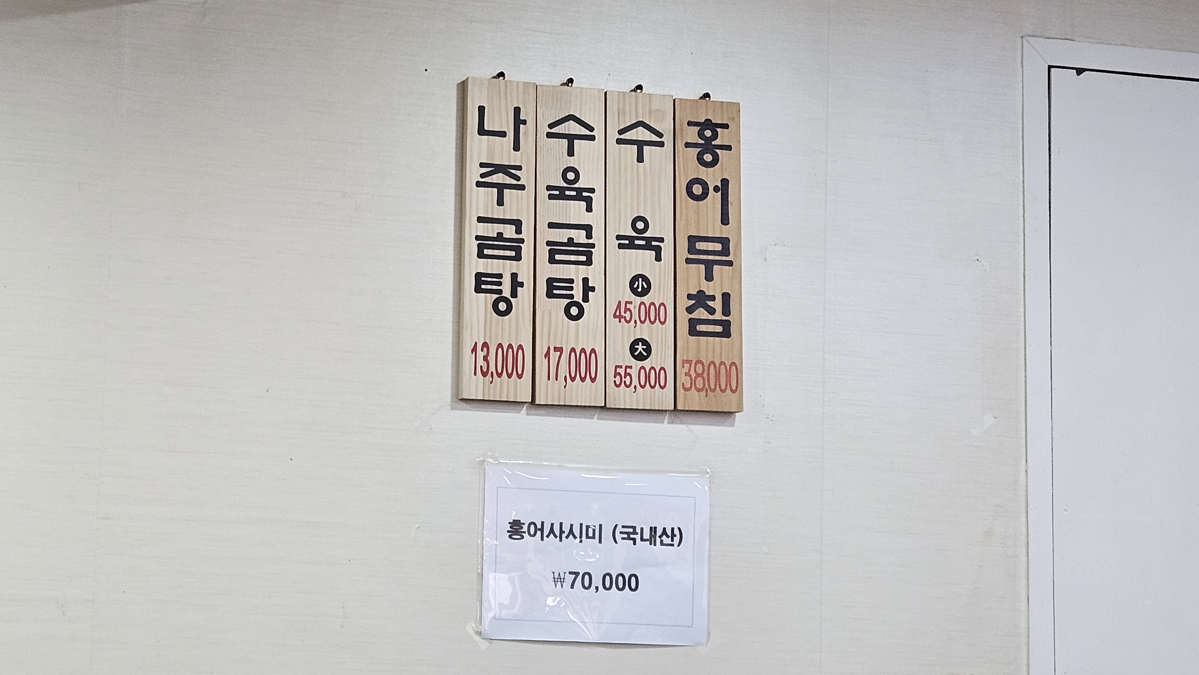 수육 45,000~55,000원, 홍어무침 38,000원, 홍어사시미 70,000원 등입니다.