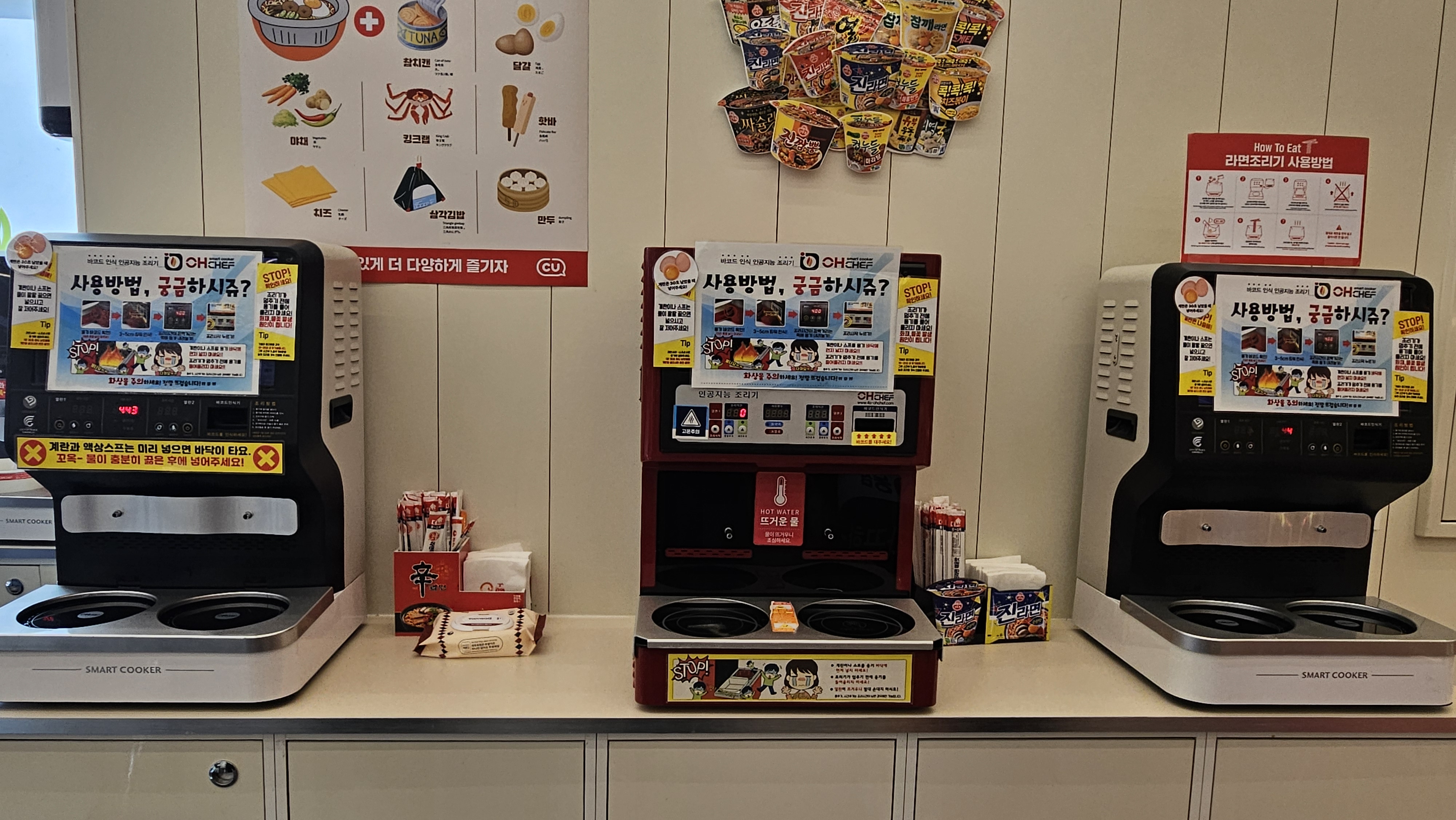 이곳에서는 라면 전용조리기를 이용해 라면을 끓여 먹을 수 있을 뿐만 아니라 다양한 토핑을 선택할 수 있는 셀프 코너도 마련되어 있습니다.