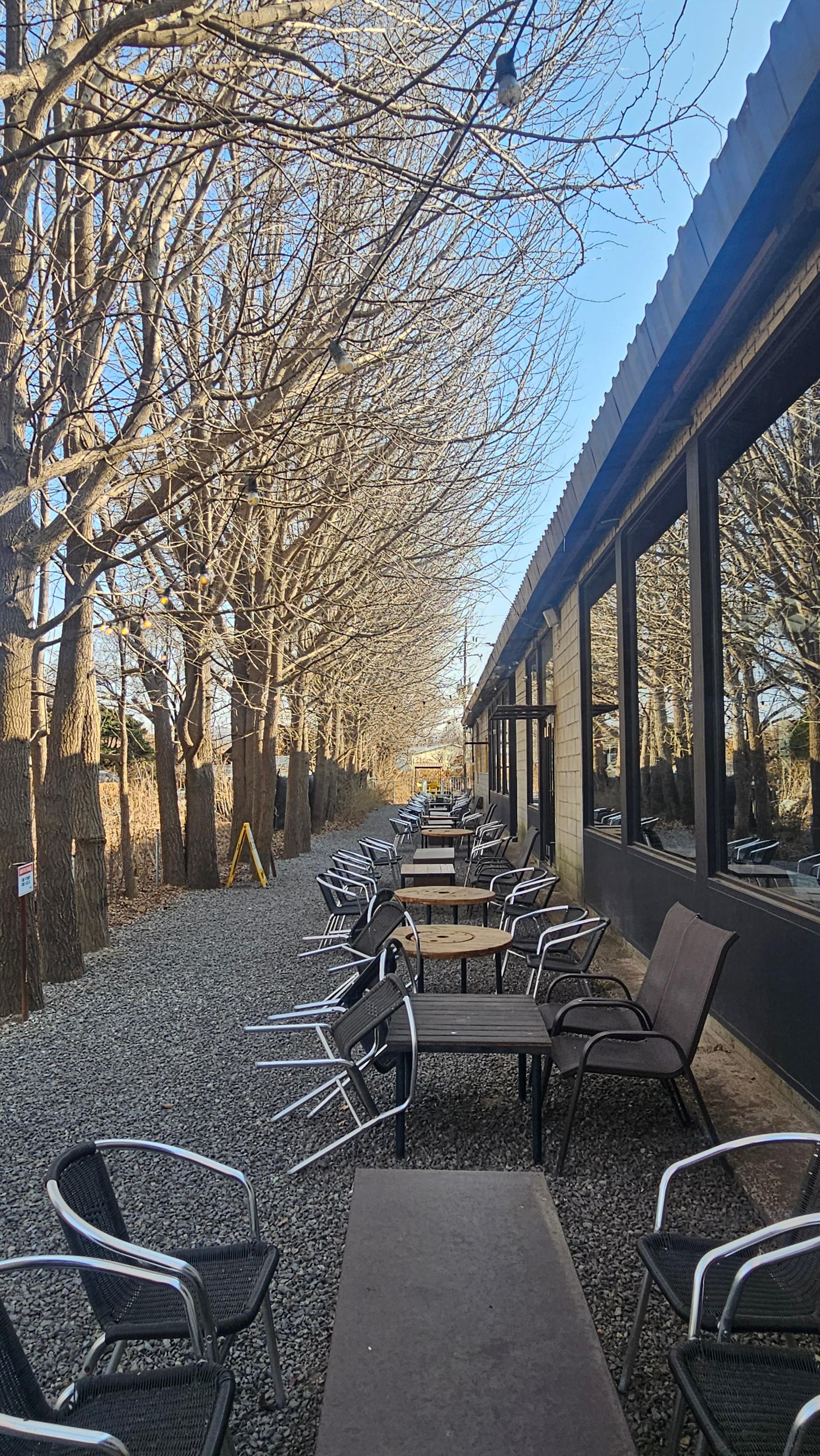 카페 옆에 즐비한 야외 테이블과 은행나무들