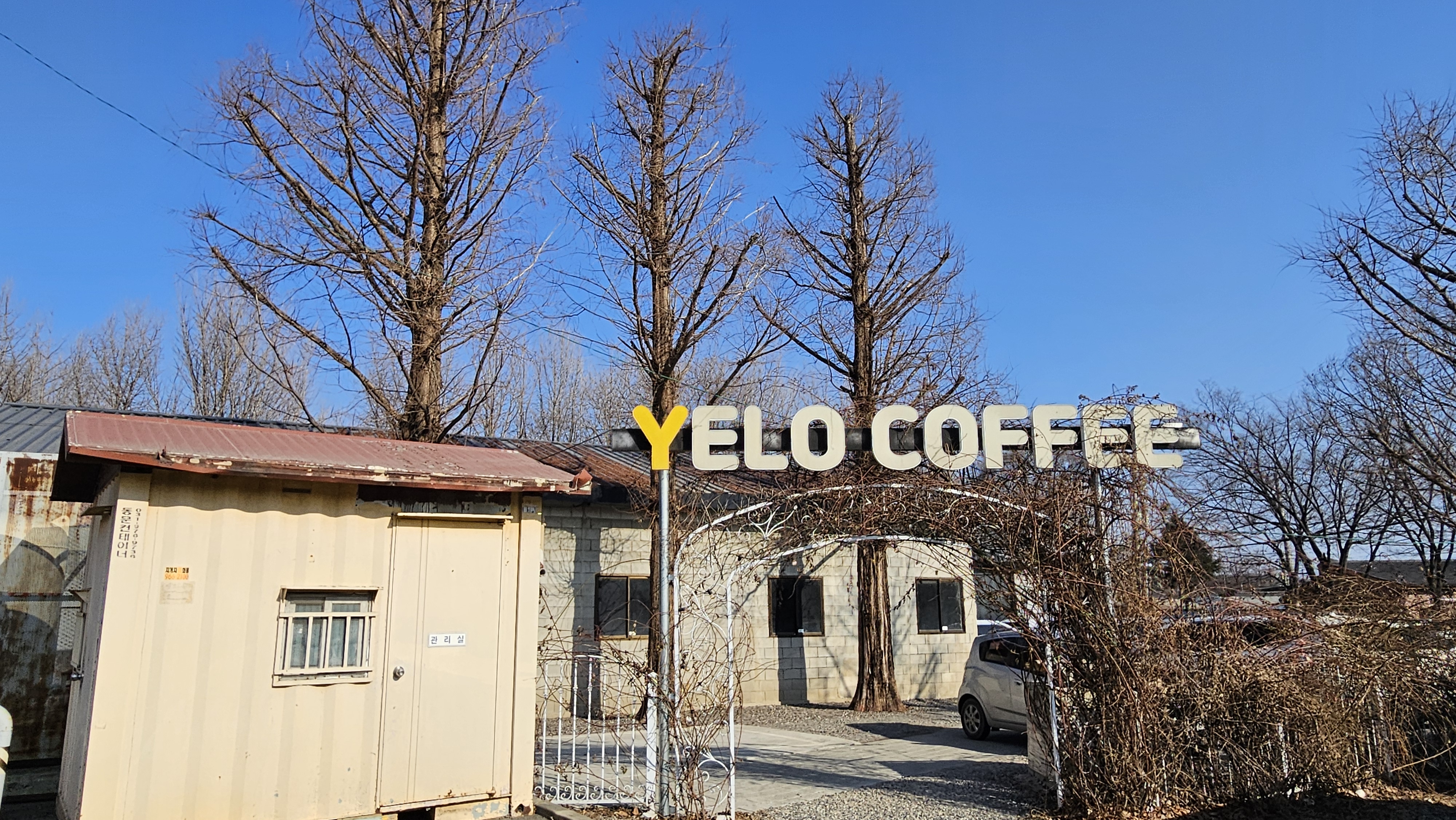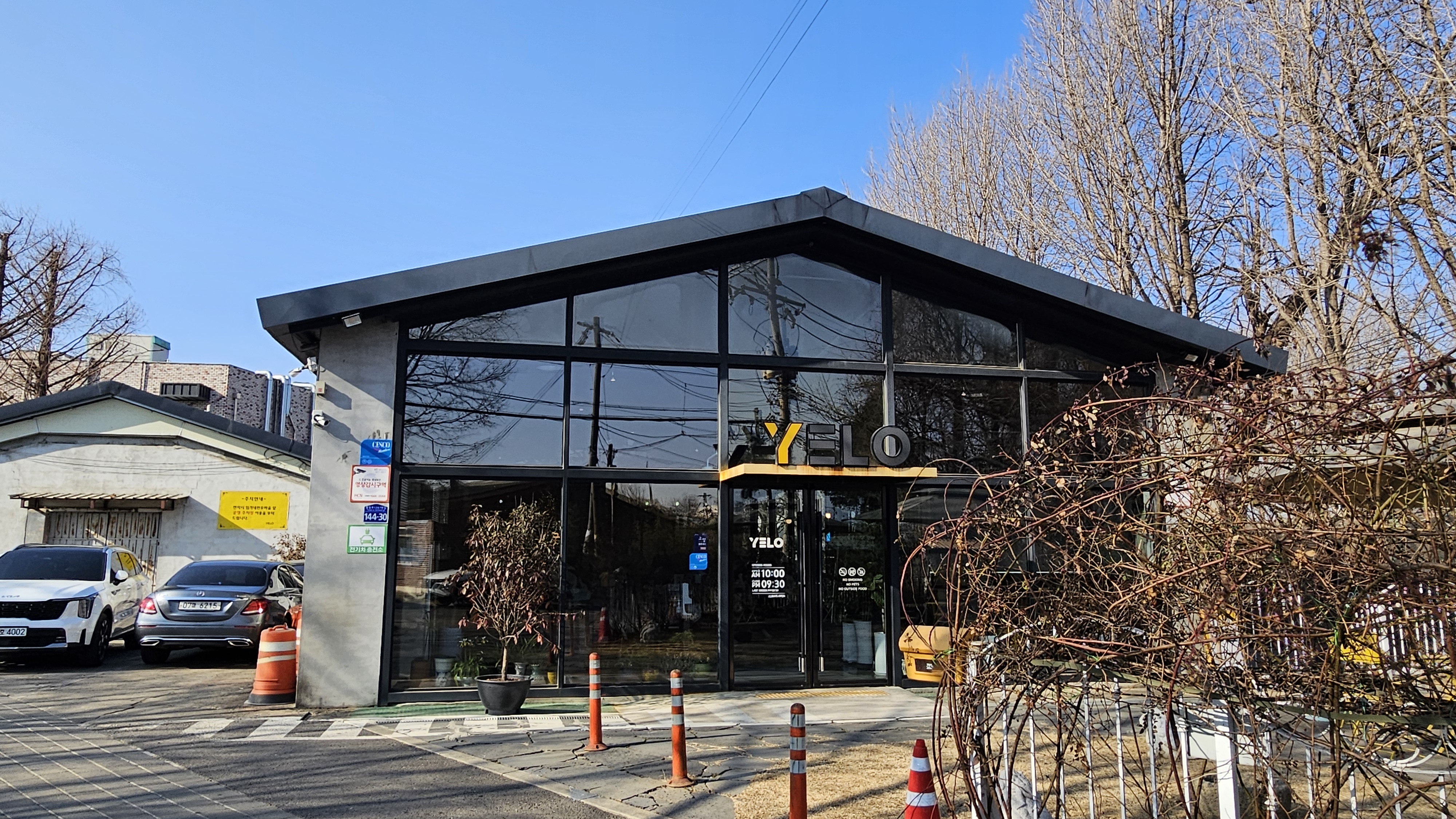 은행나무가 있는 옆에 길게 만든 카페 건물입니다.