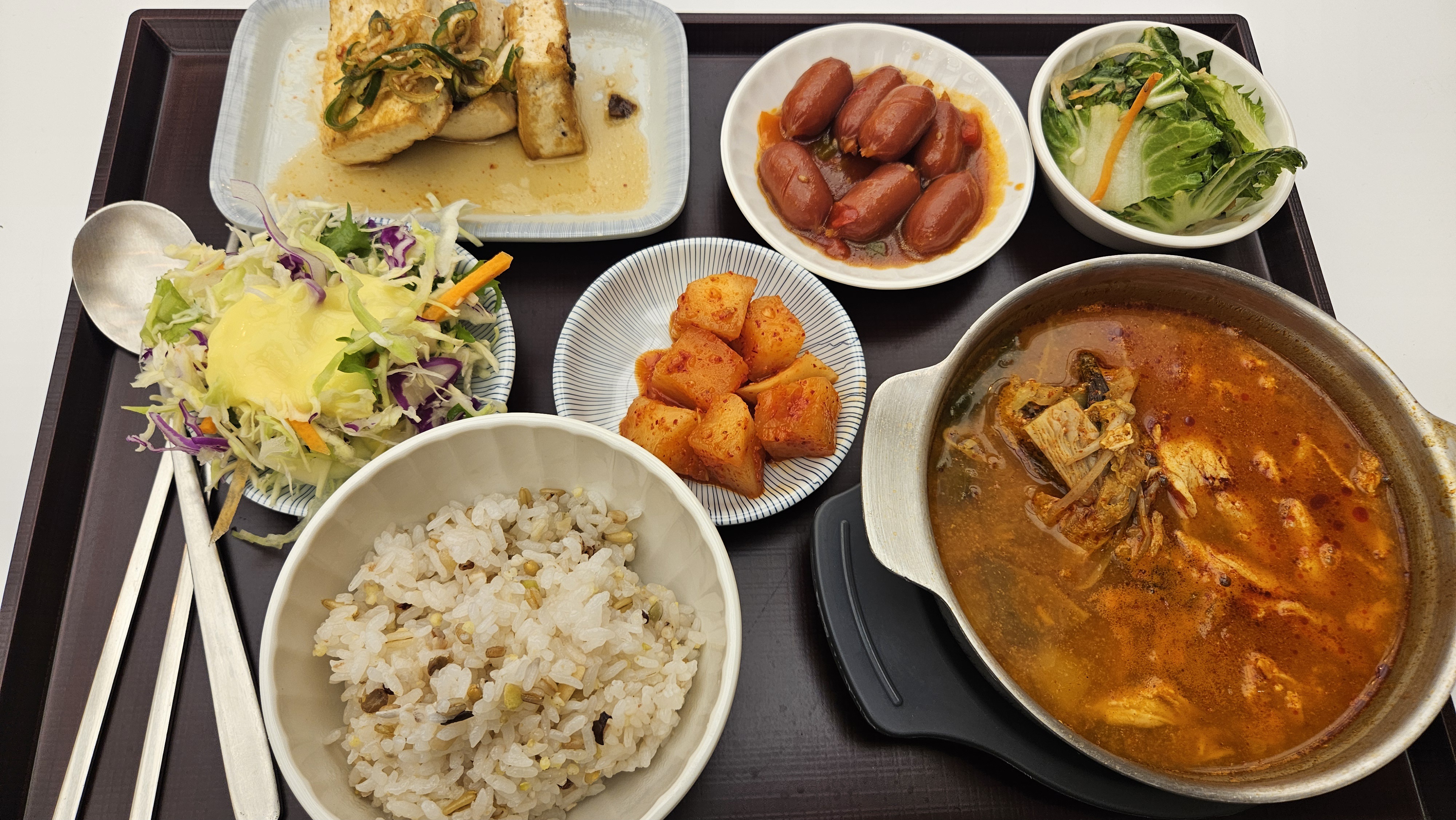 공깃밥과 닭개장, 두부와 소시지, 배추절임은 A배식코너에서 받아오고, 샐러드와 깍두기는 지율배식에서 원하는 만큼 가져다 먹을 수 있습니다.