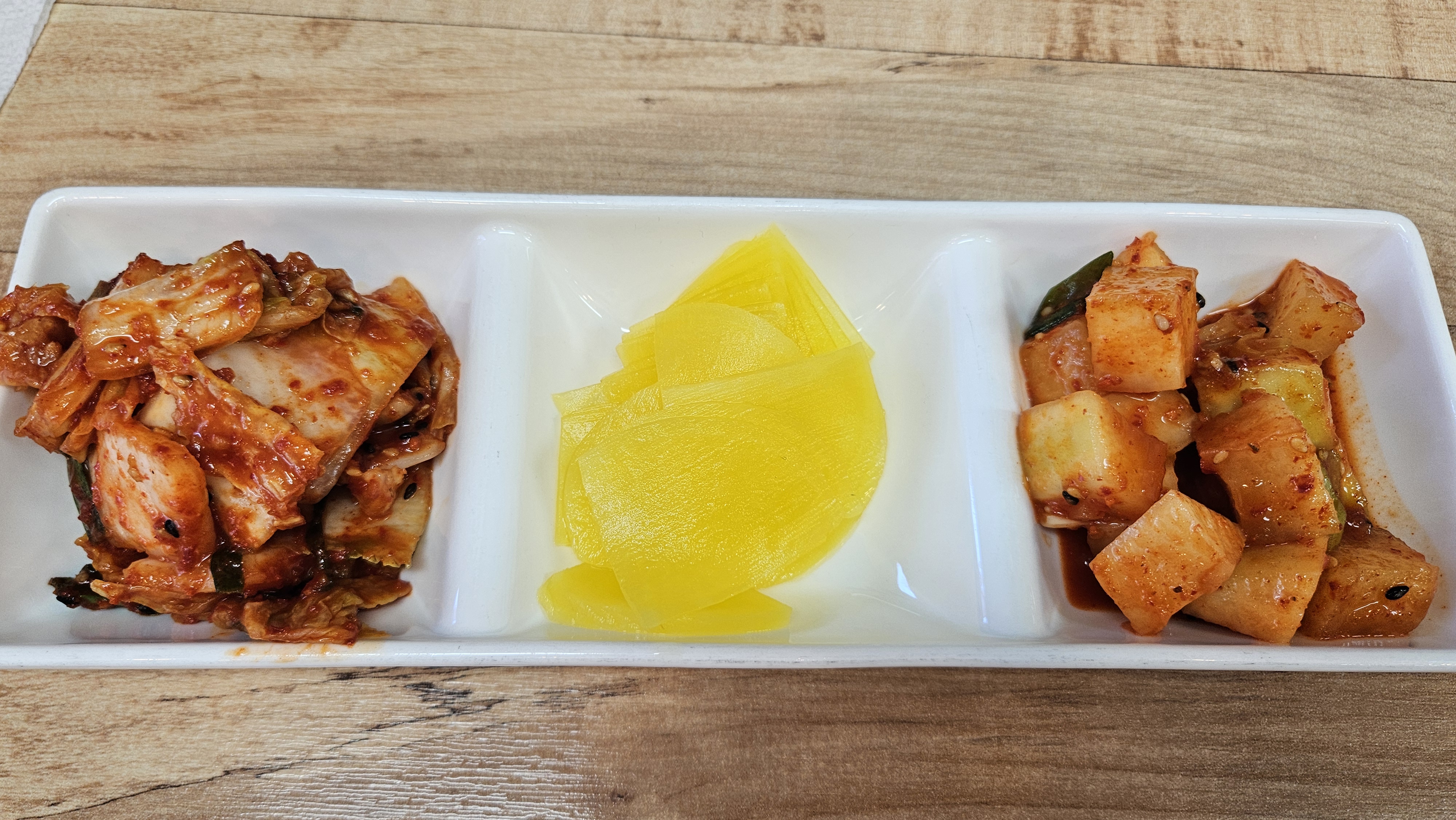 김치와 단무지, 깍두기 등이 반찬입니다.