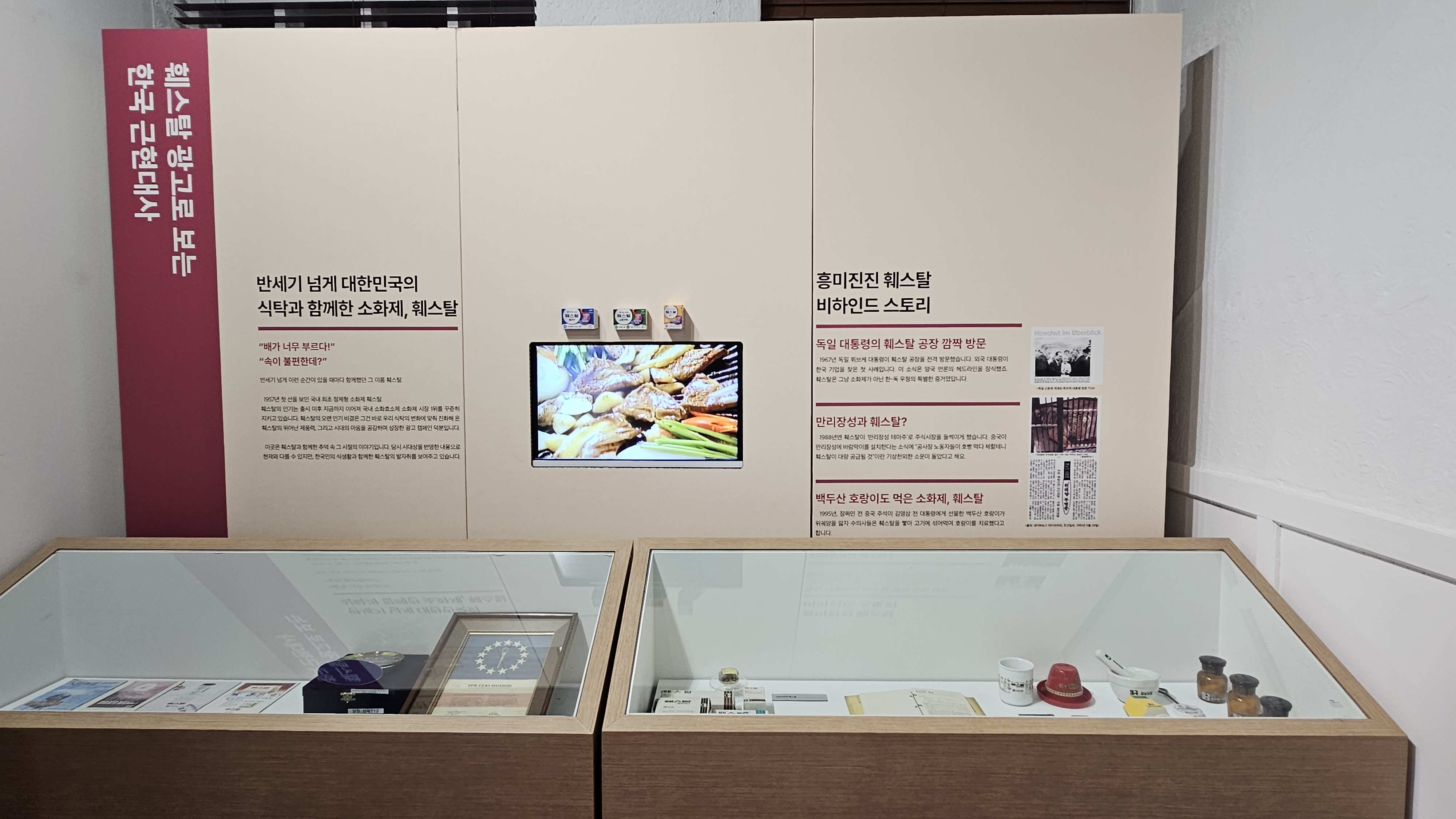 한독의약박물관이 기획한 '속 편한 박물관' 코너에서는 동의보감, 사의경험방 등 의서를 비롯해 배밀이와 인단 등 소화 관련 의약유물을 전시하고, 훼스탈 광고 변천사를 통해 한국 근현대사를 살펴볼 수 있도록 했습니다.