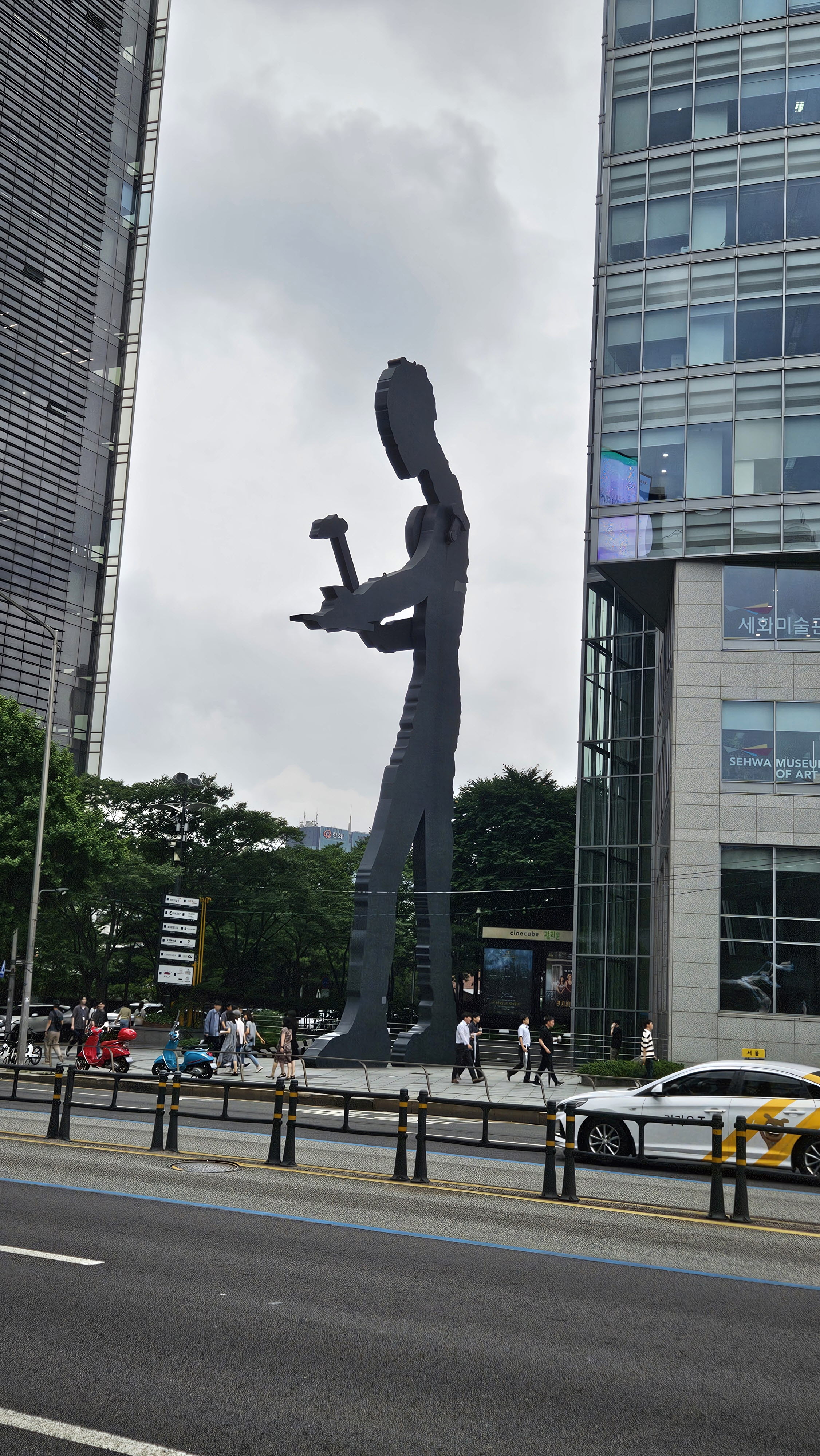 해머링맨은 미국의 조각가 조나단 브로프스키(Jonathan Borofsky)가 제작한 철제 작품 시리즈로, 세계 11개 도시에 설치됐으며, 우리나라에는 2002년 6월 4일 광화문의 한 빌딩 앞에 세계 7번째로 설치된 작품입니다.
