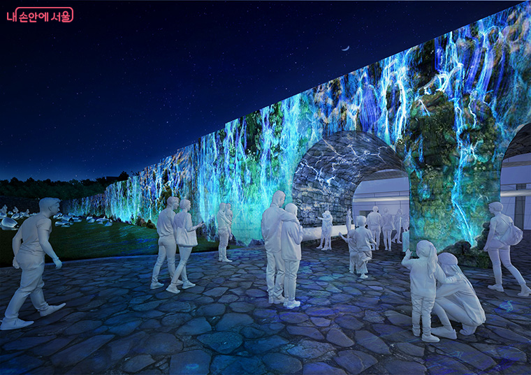 성벽을 따라 펼쳐지는 빛의 패턴과 유체 시뮬레이션을 통해 과거~미래의 시각적 여정을 감상할 수 있습니다.