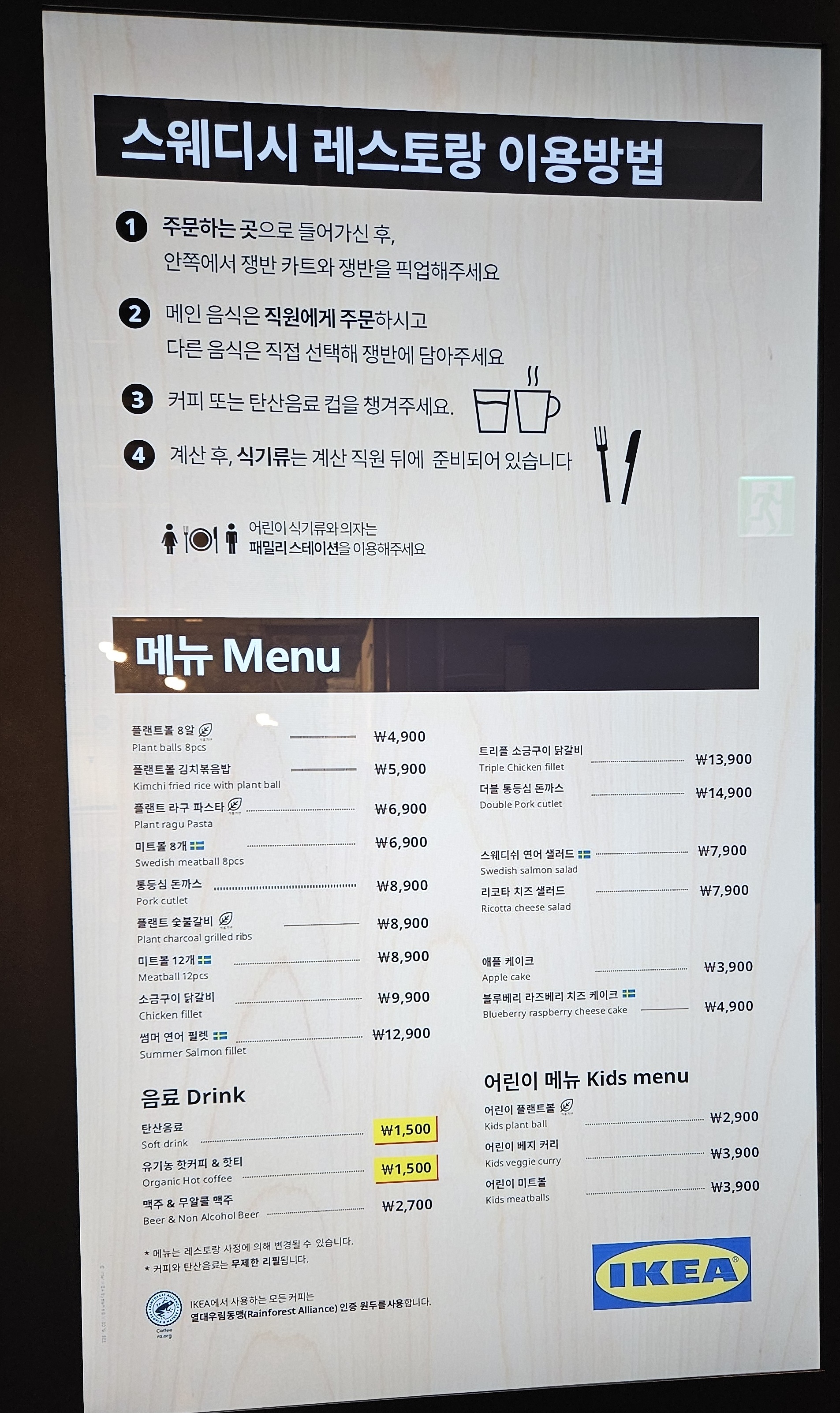 이케아 푸드코츠라고 할 수 있는 스웨디시 레스토랑과 스웨디시 비스트로, 카페 등의 메뉴 등을 담았습니다.