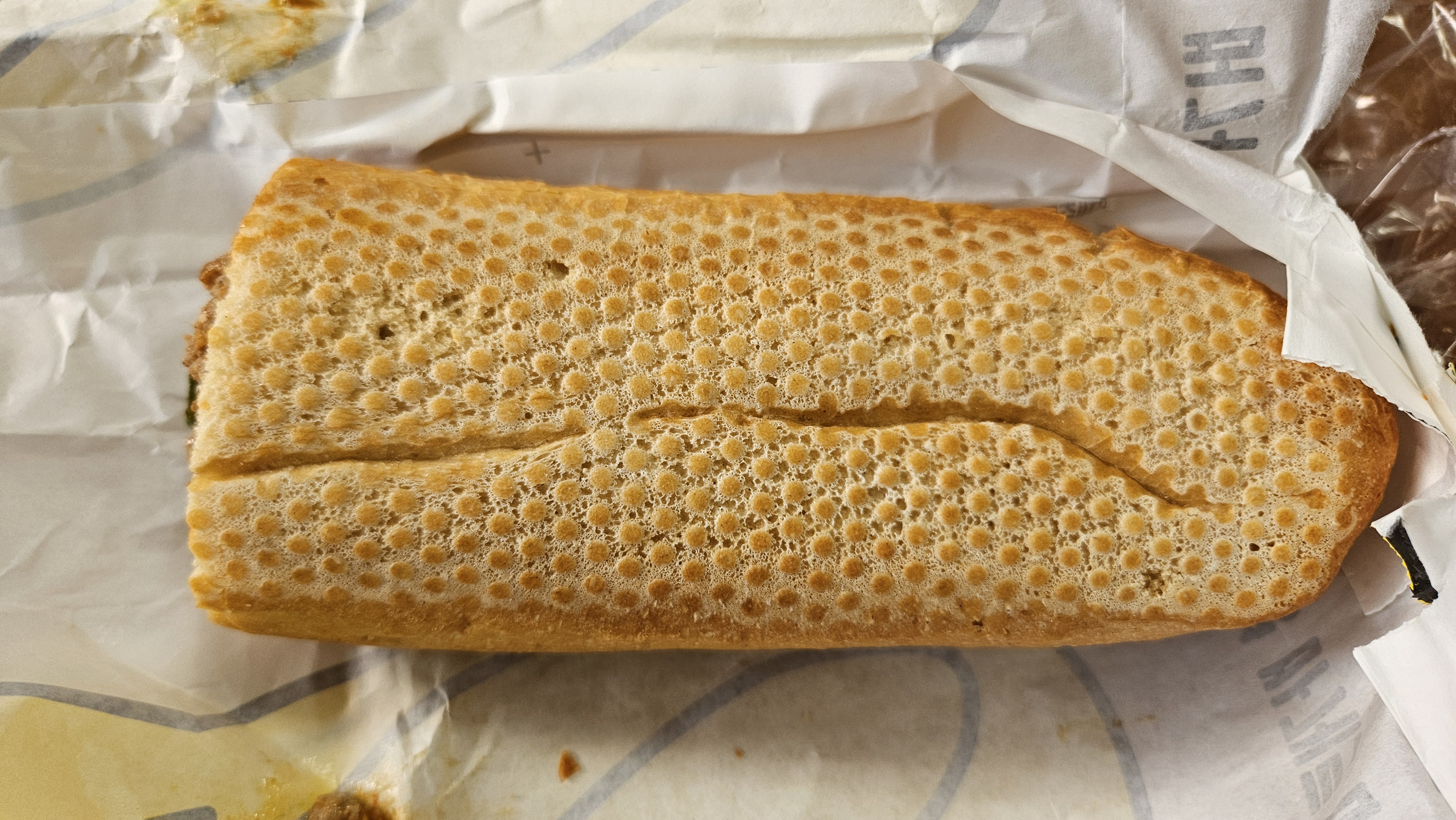 겉은 바게트 빵이라 바싹하고, 안은 야채와 다진 고기가 촉촉하게 담겨 있습니다.